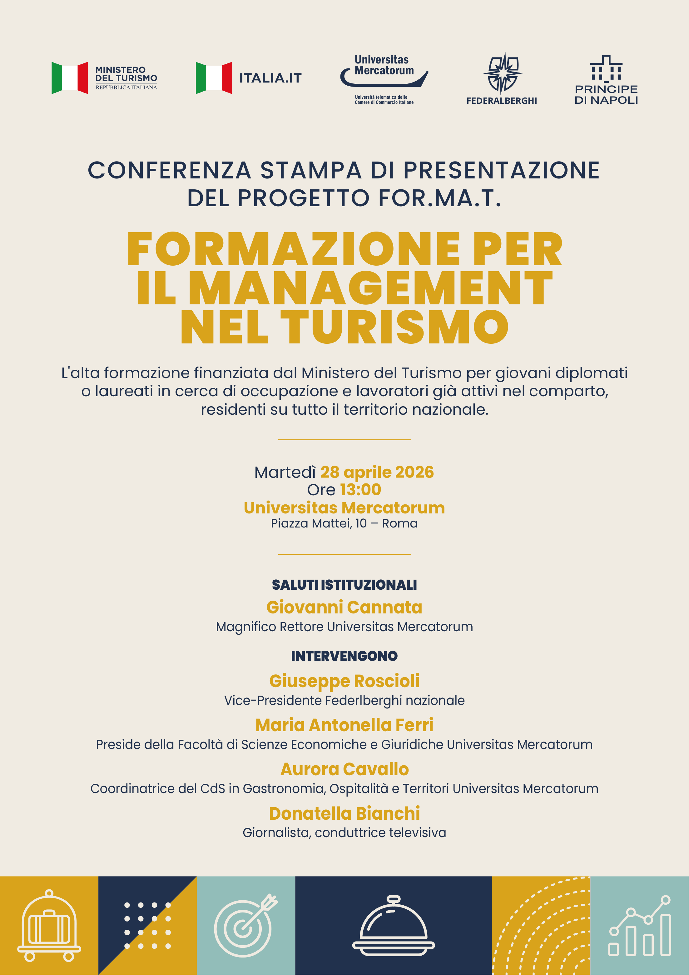 Martedì 28 aprile 2026, presso Universitas Mercatorum a Roma, si terrà la conferenza stampa di presentazione del progetto FOR.MA.T. – Formazione per il Management nel Turismo, un’iniziativa di alta formazione finanziata dal Ministero del Turismo, rivolta a giovani diplomati e laureati in cerca di occupazione, ma anche a professionisti già attivi nel comparto turistico su tutto il territorio nazionale.